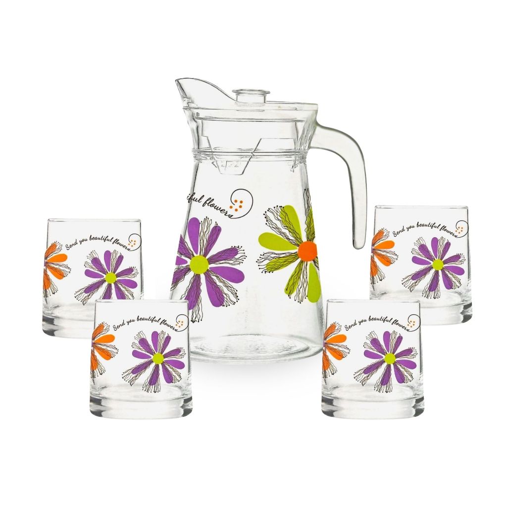 Conjunto De Jarra Suco + 4 Copos Vidro Floral Agua Suco Moderna Mesa Posta Flores Colorida Decorada Resistente Luxo Cozinha