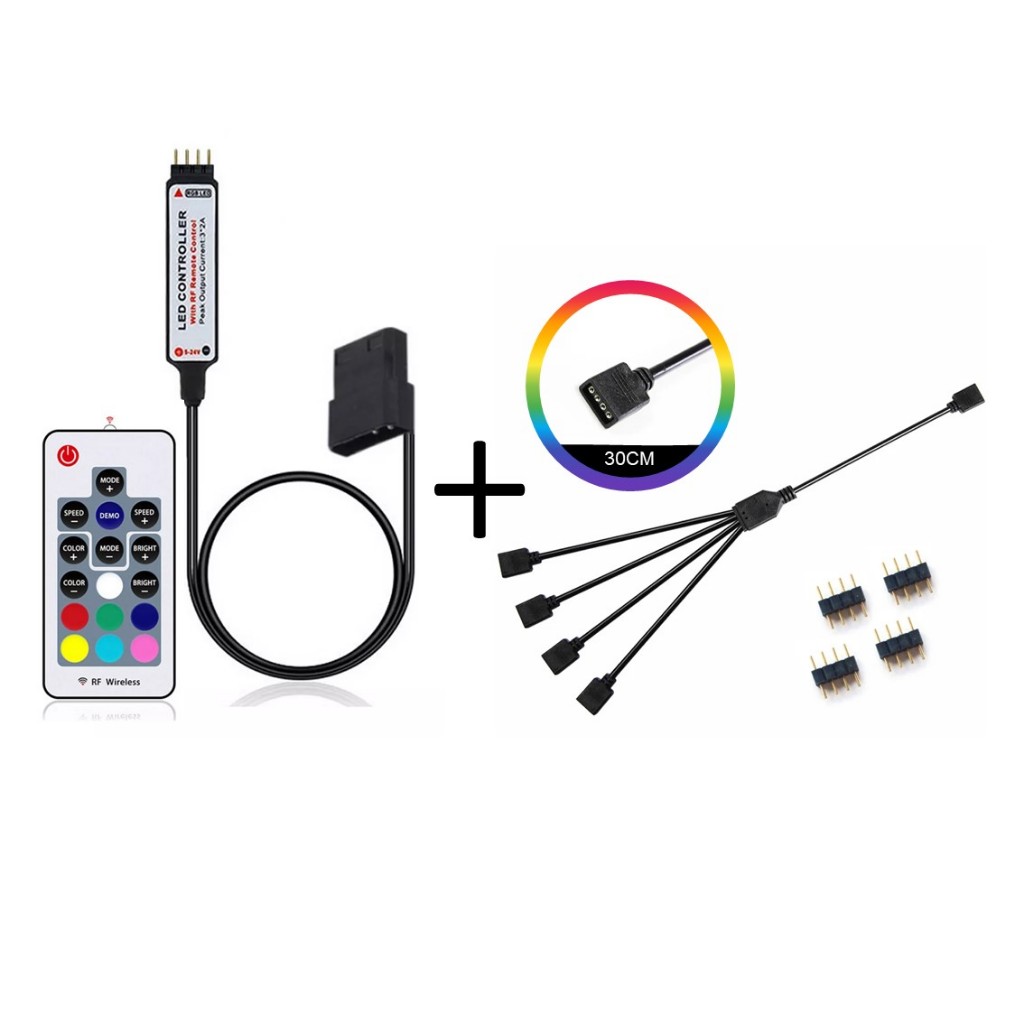 Controladora RGB Cooler Fan 4 Pinos 12v c/ Controle Remoto Conexão Sata Molex + Cabo Splitter 1 Para 4 Saídas Hub Fonte Pc Led