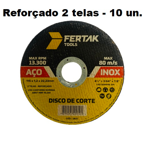 DISCO DE CORTE AÇO / INOX 4.1/2" X 3/64" X 7/8" - 115 X 1.2 X 22,23MM - 2 TELAS REFORÇADO - FERTAK COM 10 UNIDADES