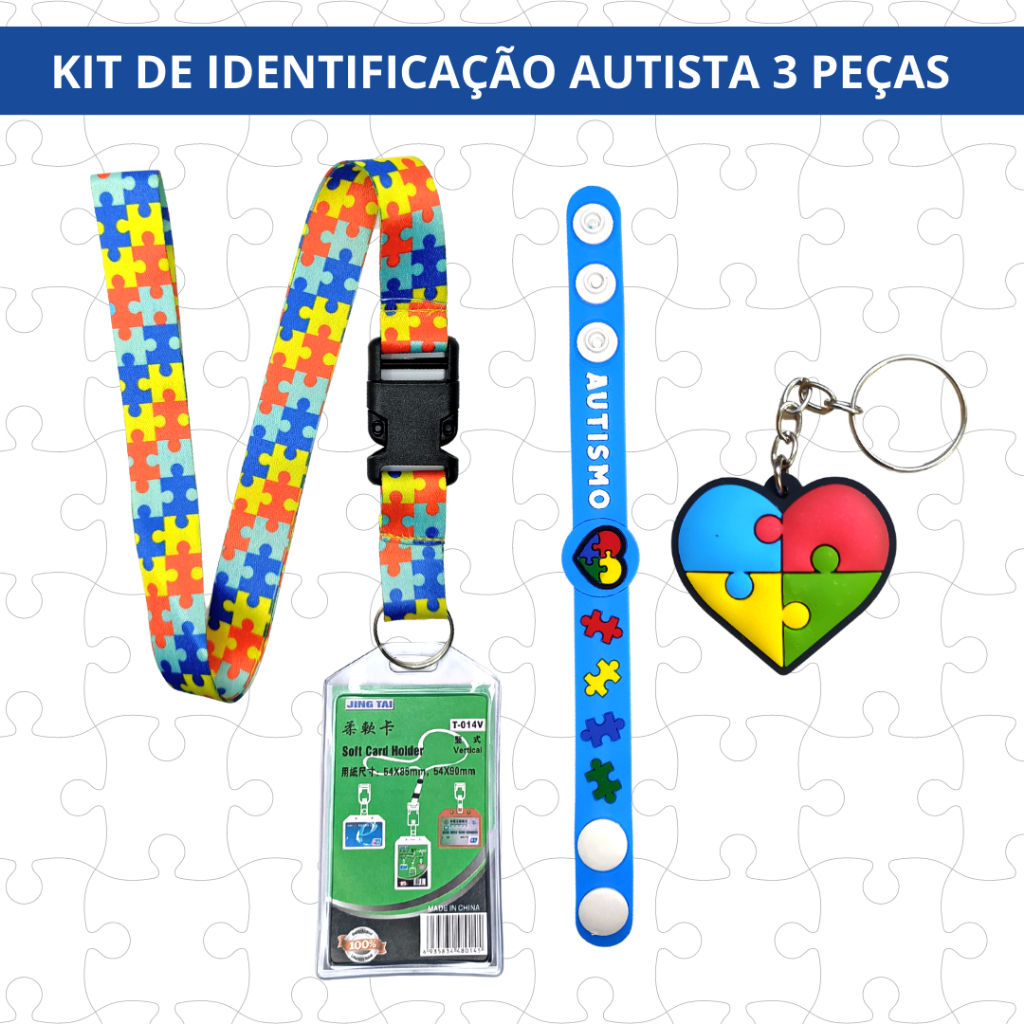 Kit 03 Peças Identificação Autismo Cordão Com Porta Crachá Pulseira Chaveiro - CÓD 008