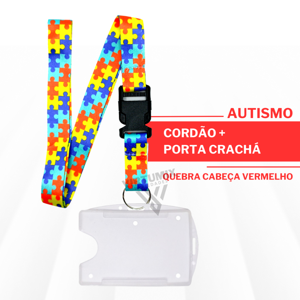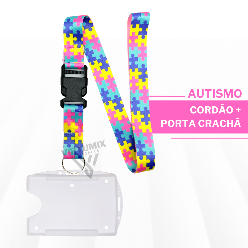 Kit Cordão Autismo Quebra Cabeça com Porta Crachá Horizontal e Vertical Transparente Autista