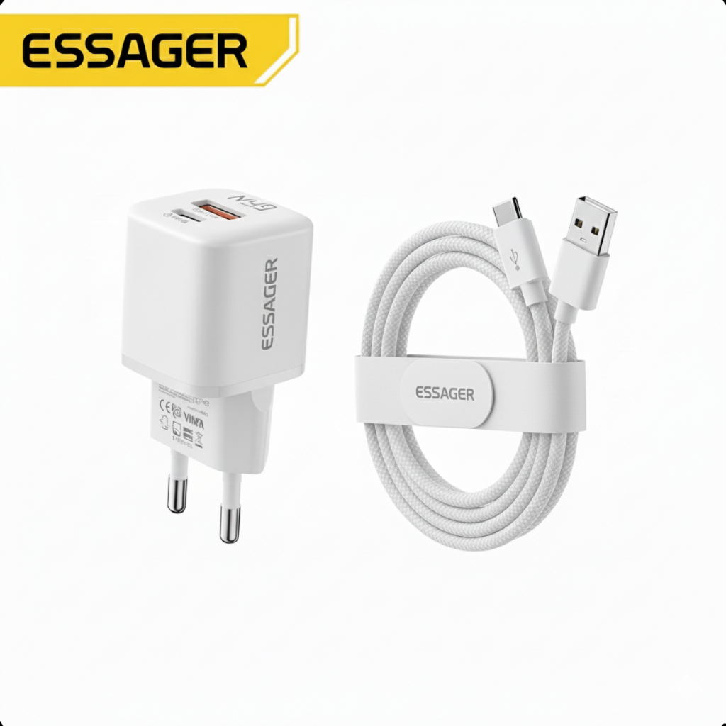 Kit Carregador Turbo GaN 20W + Cabo Essager USB-C | Fast Charge PD para iPhone, Samsung, Xiaomi e iPad
