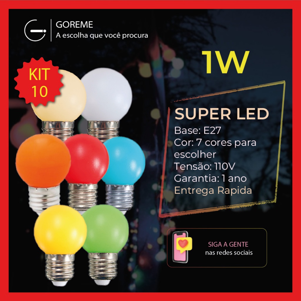 Kit 10 Lâmpadas Coloridas Led Mini Bulbo Bolinha 1w 110V E27 Luz Colorida Vermelho | Azul | Amarelo | Laranja | Branco Frio | Verde | Branco Quente | Azul