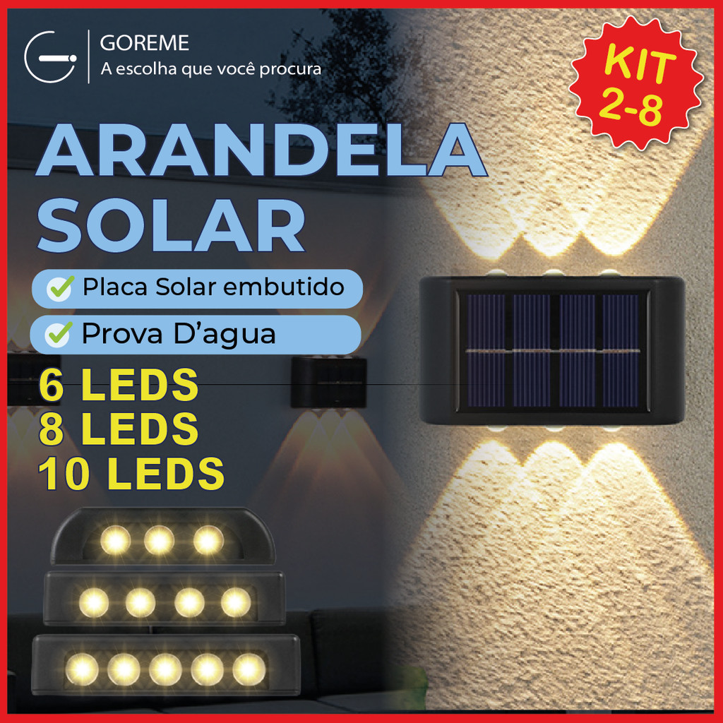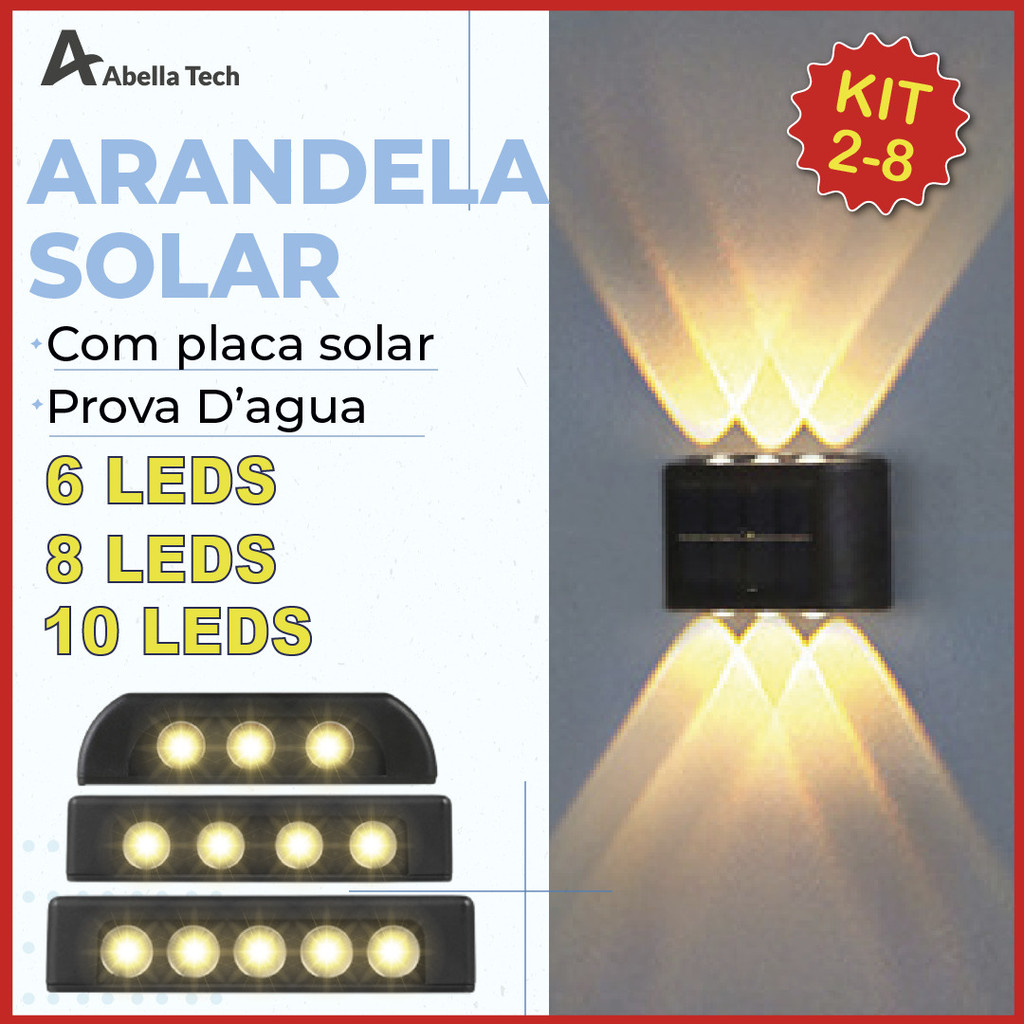 Kit 8 Luminária Arandela Solar 6 8 e 10 LED Luz Branco Quente para Parede a Prova dágua Spot parede