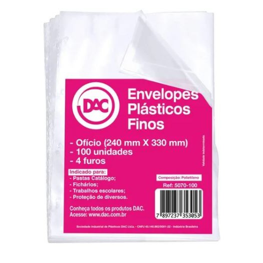 Saco Envelope Plástico 4 Furos/Sem Furos Grosso/Fino Ofício/A4 Pacote Com 100 Unidades ACP