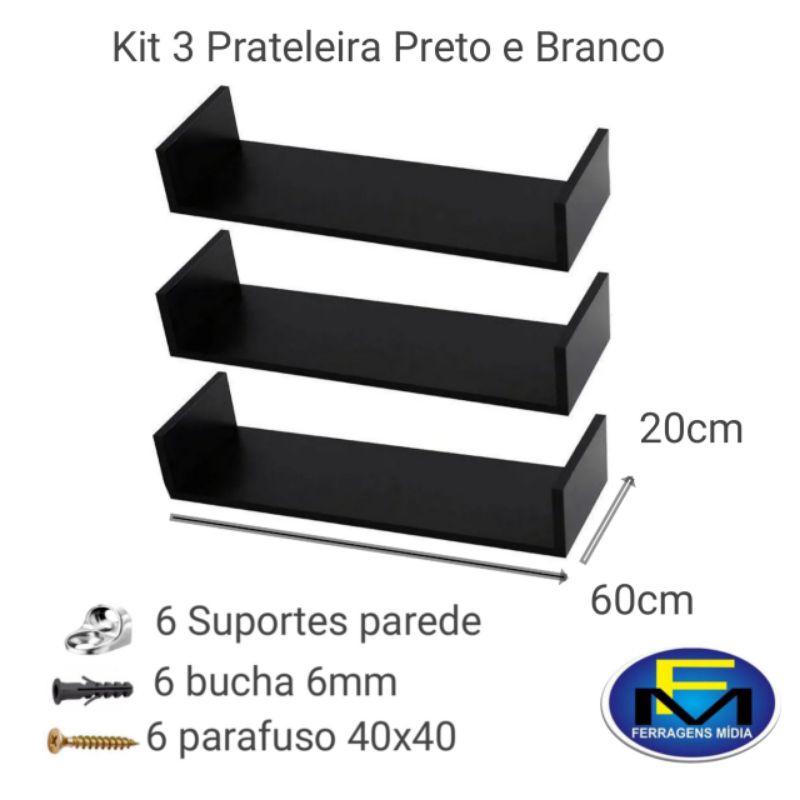 kit 3 Prateleira em U Preto e Branco 60x20cm para Livros Quartos Salas Cozinhas NIchos de banheiro