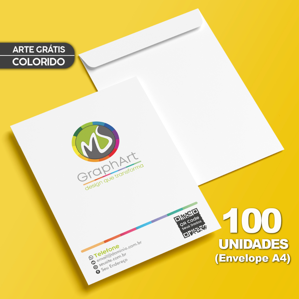 100 Envelopes Personalizados A4 - Arte Grátis - Papel Offset 90g Branco Colorido com sua Logo Marca