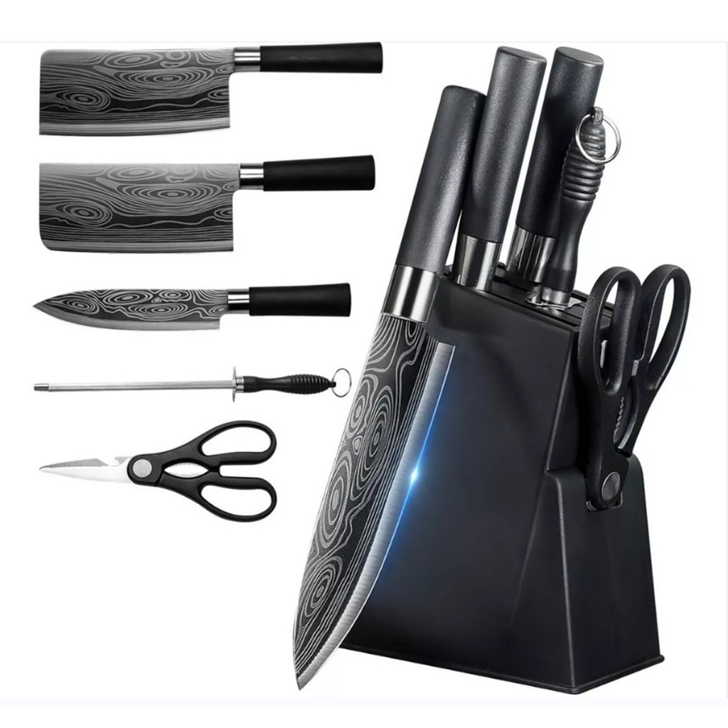 Jogo kit 7 peças facas Tabua Descascador Tesoura Profissional Cozinha- Faqueiro Gourmet Faca de Churrasco