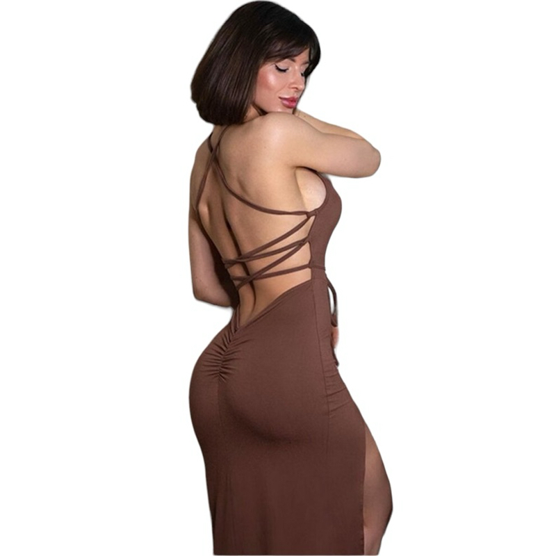Vestido femenino Longo Fenda na frente costa nua Empina Bumbum Alca Trançado nas costas