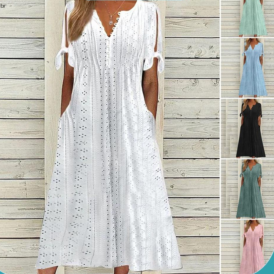 Vestido De Verão Mulher Cor Sólida Manga Oca Fora Curta V Botões De Pescoço Namoro Bolsos De Renda Linha A Lady Midi Feminino