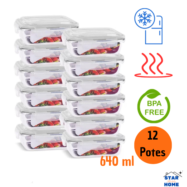 Kit 12 Potes de Vidro 640ml Hermético Marmita Fit com Tampa 4 Travas