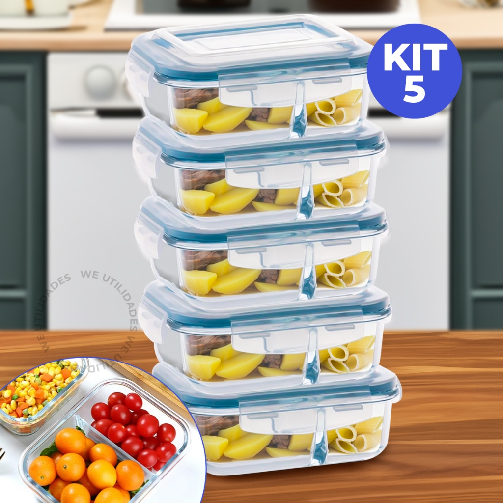 Kit 5 Potes De Vidro Hermético Com Divisória Marmita Tampa Silicone 640ml