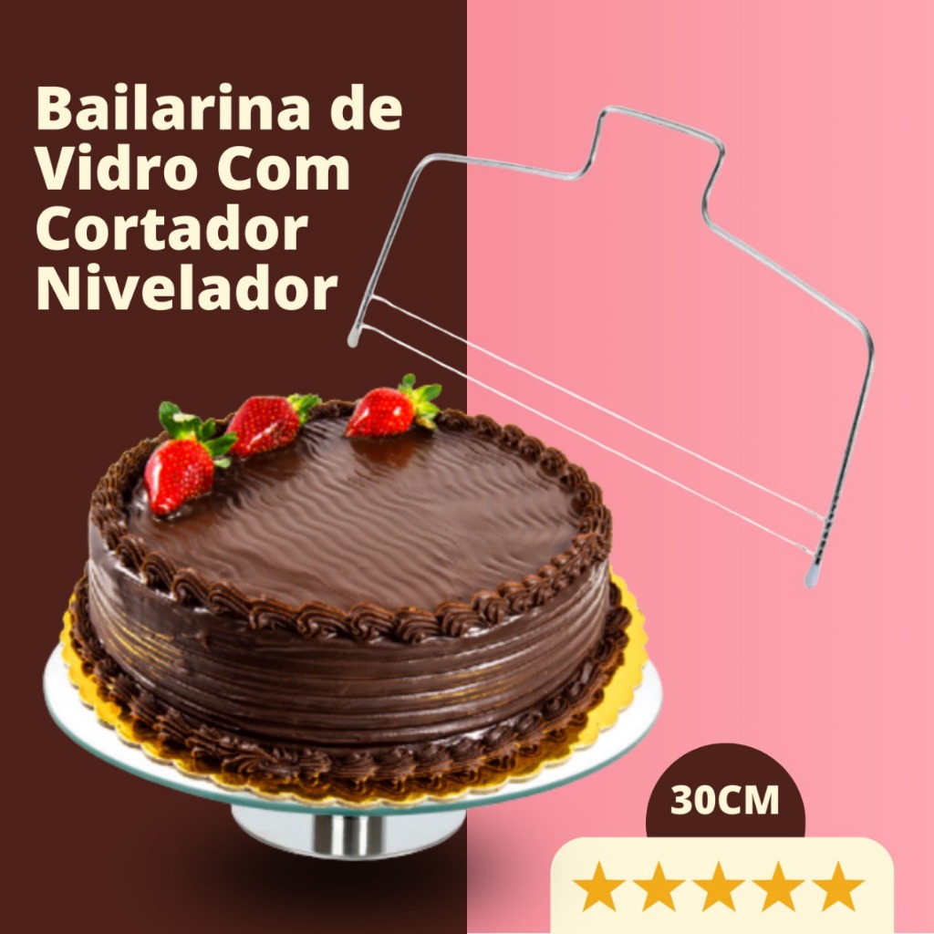 Kit Bailarina de Vidro Giratória Para Confeitar Decorar Bolo Torta 30 cm Com Nivelador Fatiador Cortador De Bolos Camada