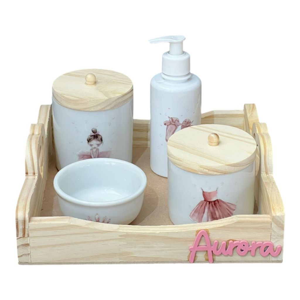Kit Higiene Bebê Porcelana Bailarina Bandeja Coração ou Nuvem Adesivo Dtf Uv Com Nome Personalizado 4 potes