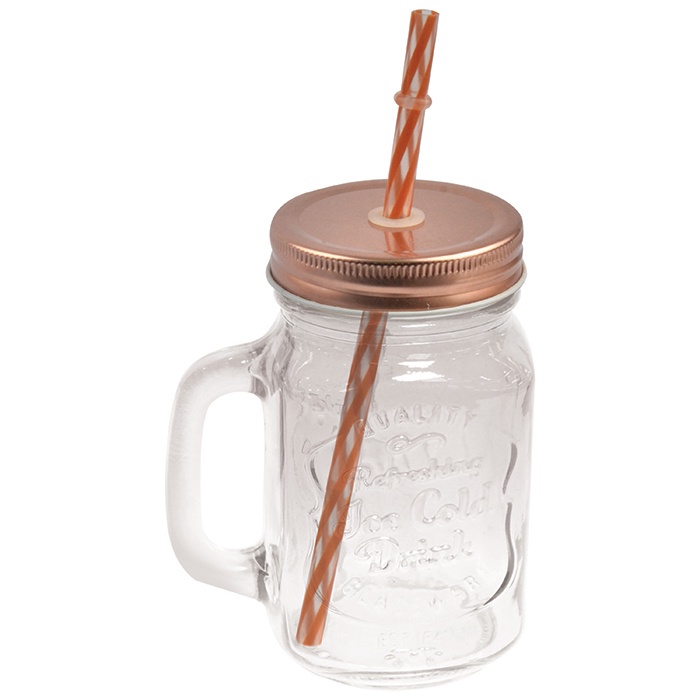 Caneca jarrinha copo retrô de vidro c/ tampa Rose Vintage e Canudo listrado 500ml. Para Drinks, vitaminas e sucos.