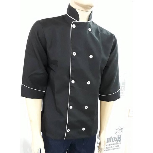 DOLMA PRETA GG COM FRISO E BOTÃO BRANCO MANGA 3/4 UNISSEX CHEF JALECO COZINHA