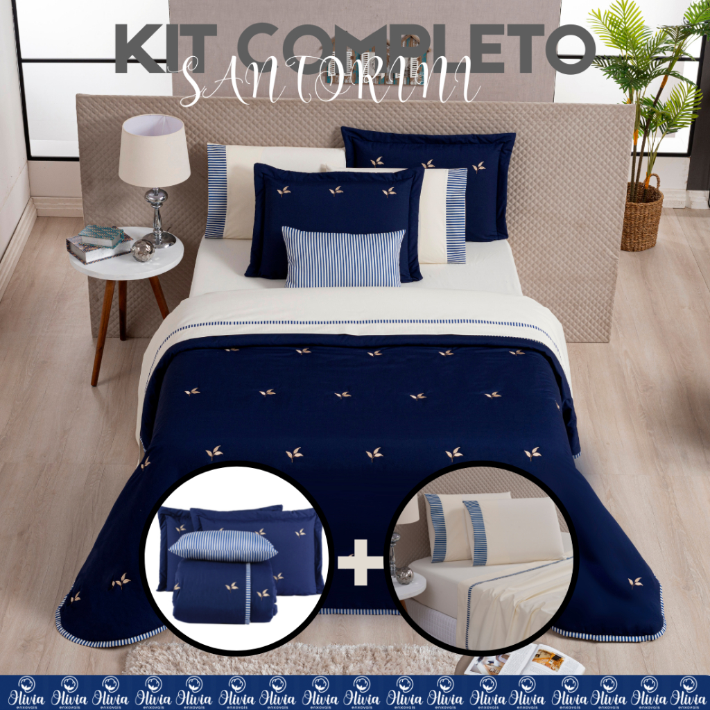 Kit Completo 09 Peças Queen Cobre Leito + Jogo Lençol Roupa de Cama 200 Fios Santorini