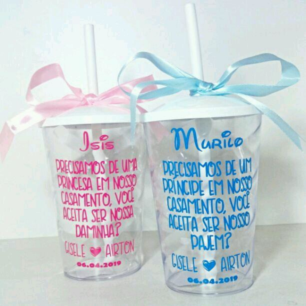 Kit 2 Copos Convite Daminha e Pajem com Tampa e Canudo 500ml