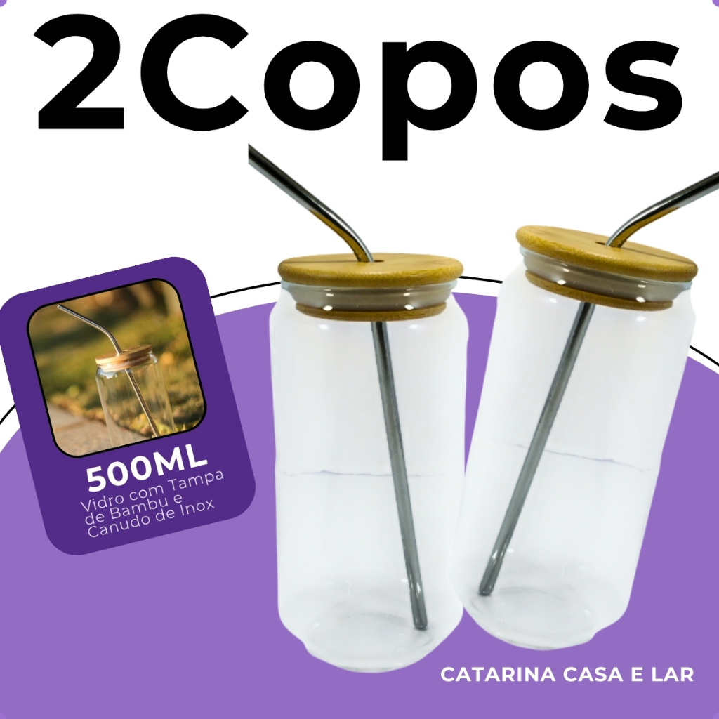 Kit 2 Copos de Vidro com Tampa de Bambu e Canudo de Inox 500ml