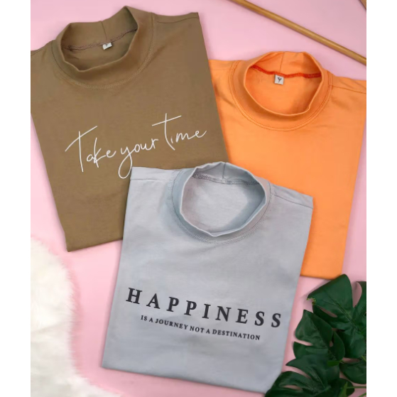 T-Shirt Feminina Gola Alta Blusa Camisa 100% Algodão Várias Cores 2023