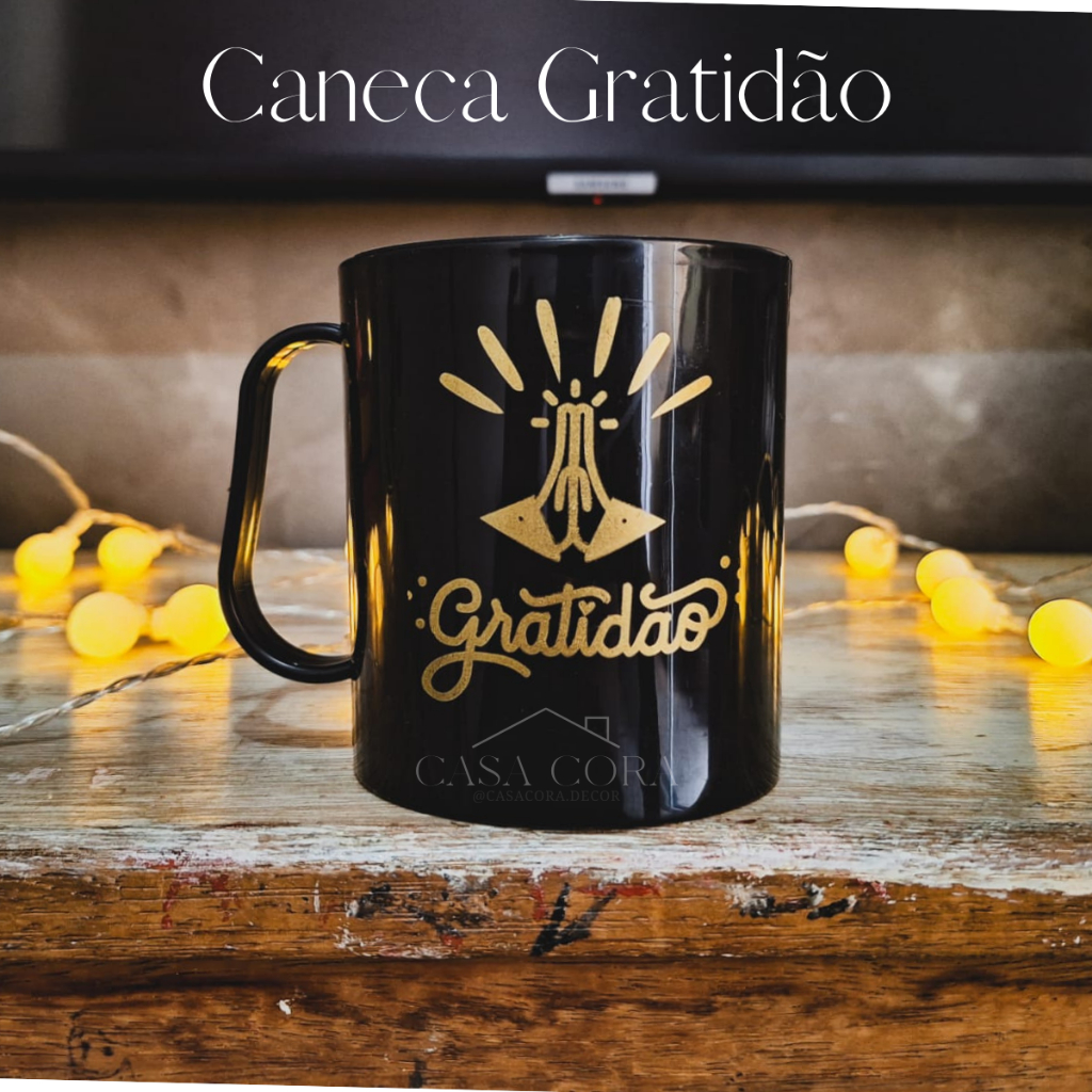 Caneca Gratidão Preta Kit Com 5, 10, 20 ou 30un Plástica Personalizada 300ml Canecas Presente Lembrancinha Igreja ou Culto.