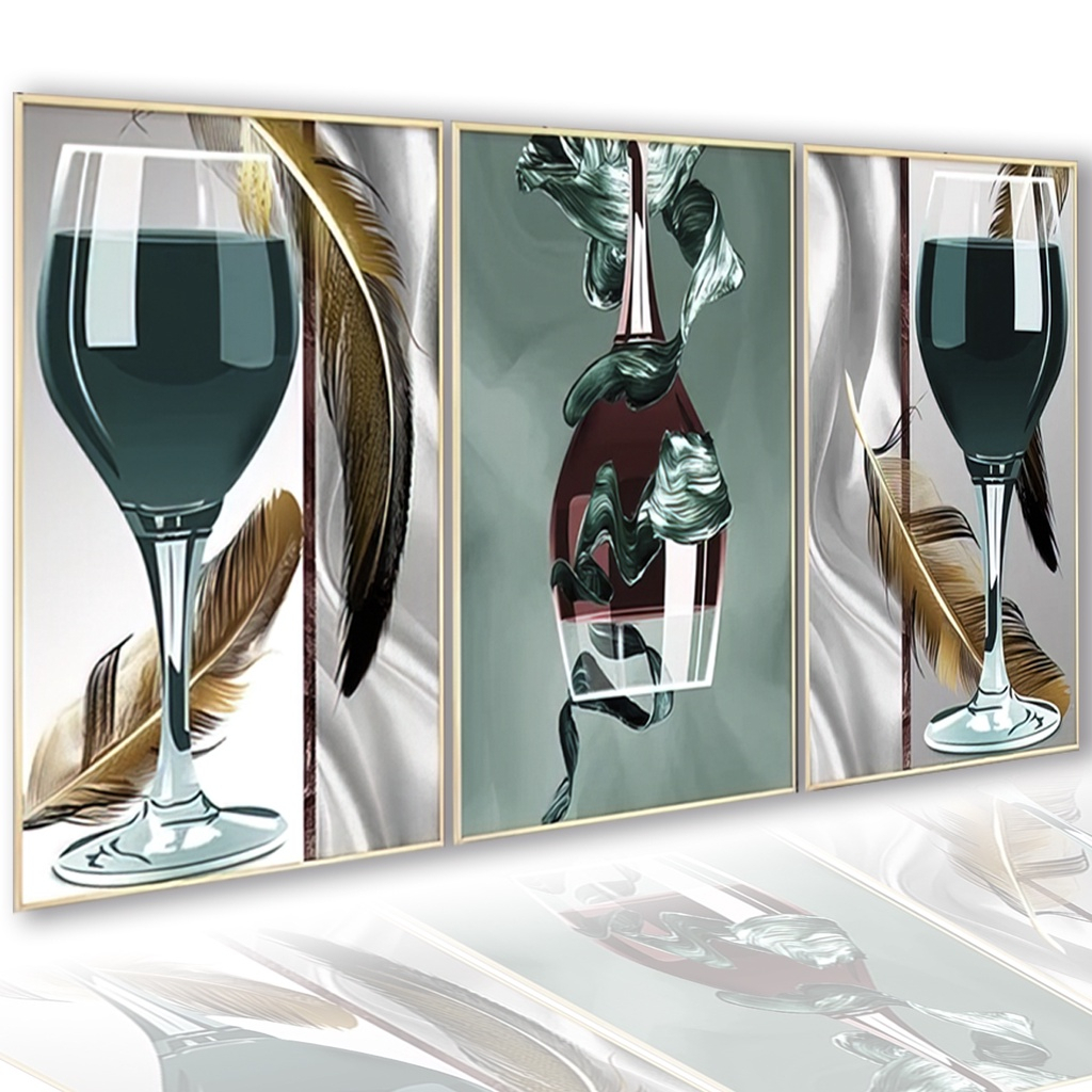 Kit Quadros Decorativos Mosaico 3 Peças Trio Taça Vinho Vinhedo Abstrato Modular Personalizado Luxo Dourado Copa Cozinha Vintage Flor Personalizado
