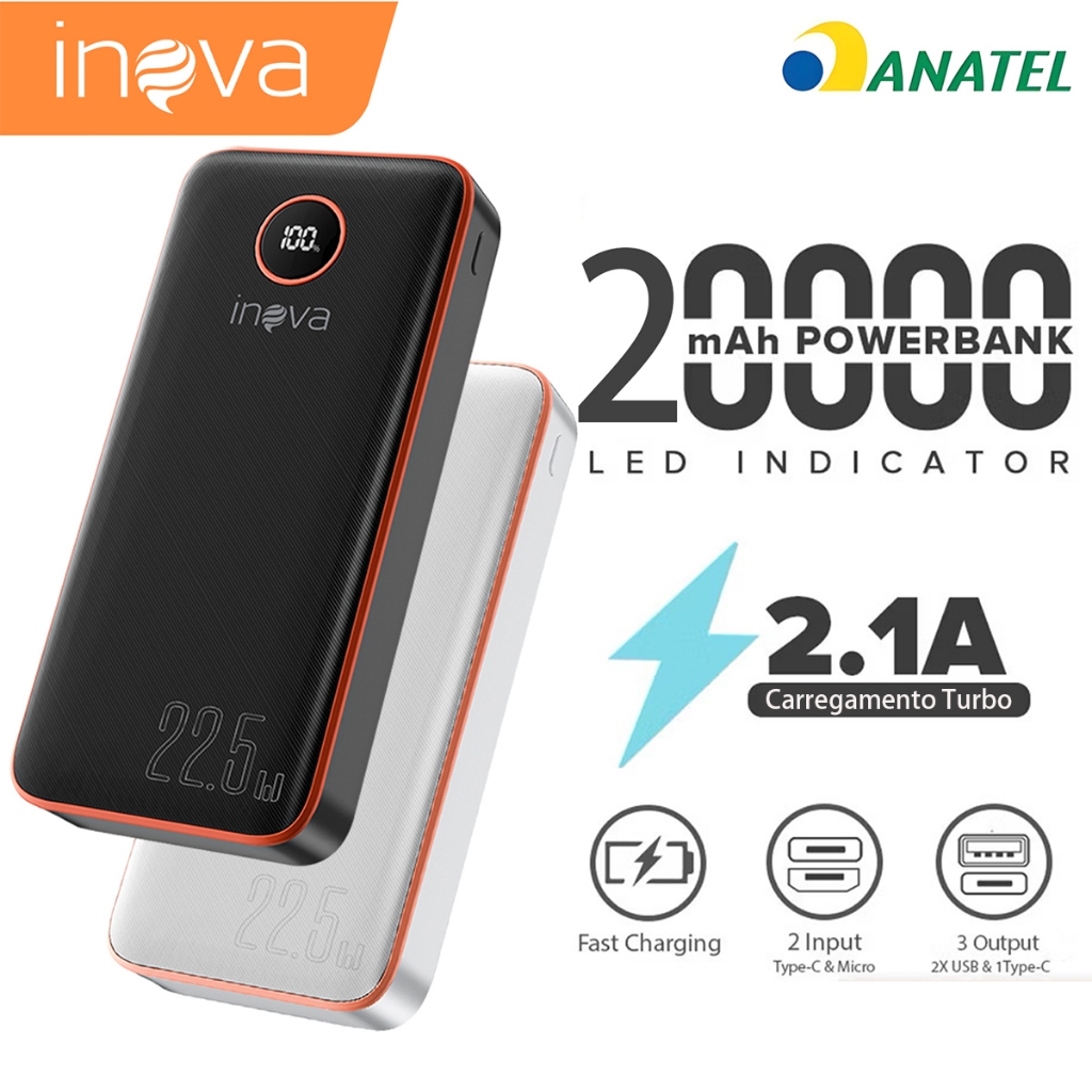 INOVA Power Bank 20000mAh Carregador Portátil Turbo 22.5W Visor LED Tipo C Lightning