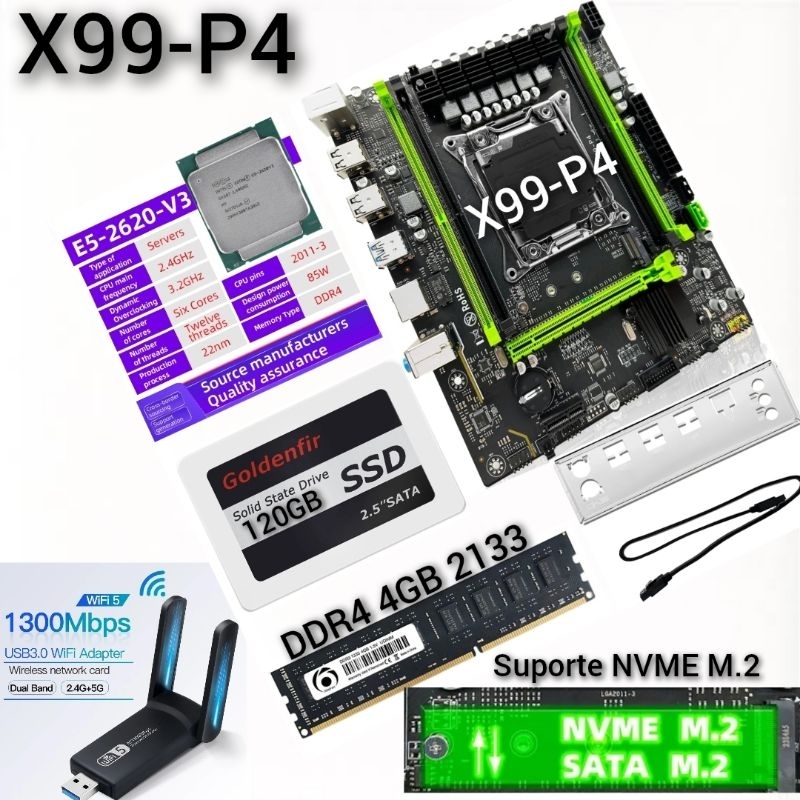 Placa mãe ZSUS X99-P4 Motherboard Intel Lga 2011-3 Xeon E5 2620-V3 CPU DDR4 4GB 2133MHZ SSD 120GB, WI-FI USB 1300Mbps 2.4/5.0 Ghz NVME M.2 Sata