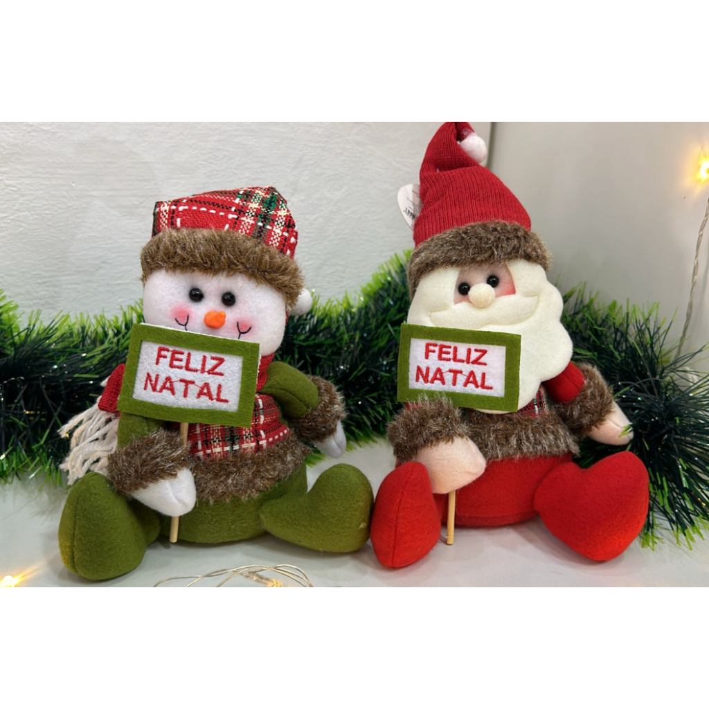 Enfeite Papai Noel e Boneco de Neve Sentado Placa Feliz Natal