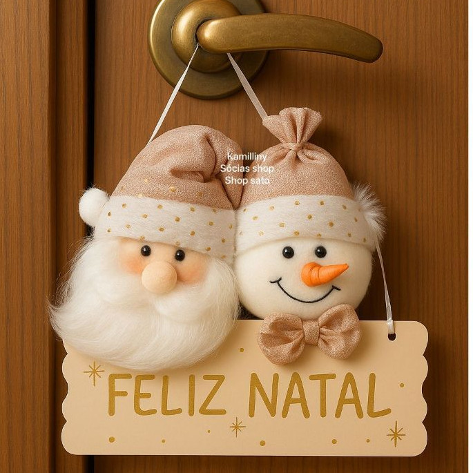 Enfeite Papai Noel Boneco De Neve Com Placa "Feliz Natal" Nude Dourado Decoração Para portas