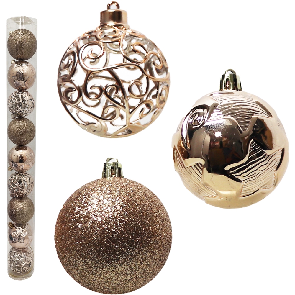 Bola Natal Champanhe 9 Pcs Mista Glitter/Estrela Alto Relevo/Arabesco Vazado