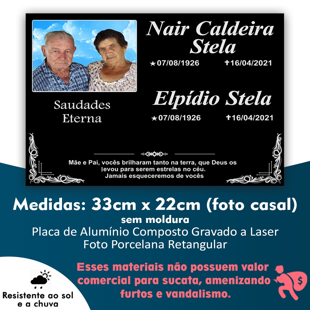 Placa para Jazigo, Túmulo, Lápide de alumínio composto / Cemitério 33x22cm (Foto casal em porcelana 12x9cm)