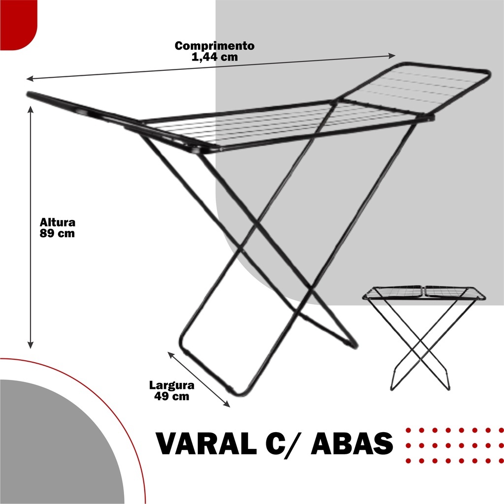 Varal de Chão com Abas Reforçado Aço Dobrável 1,35M Aberto Machado Suporta ate 20KG