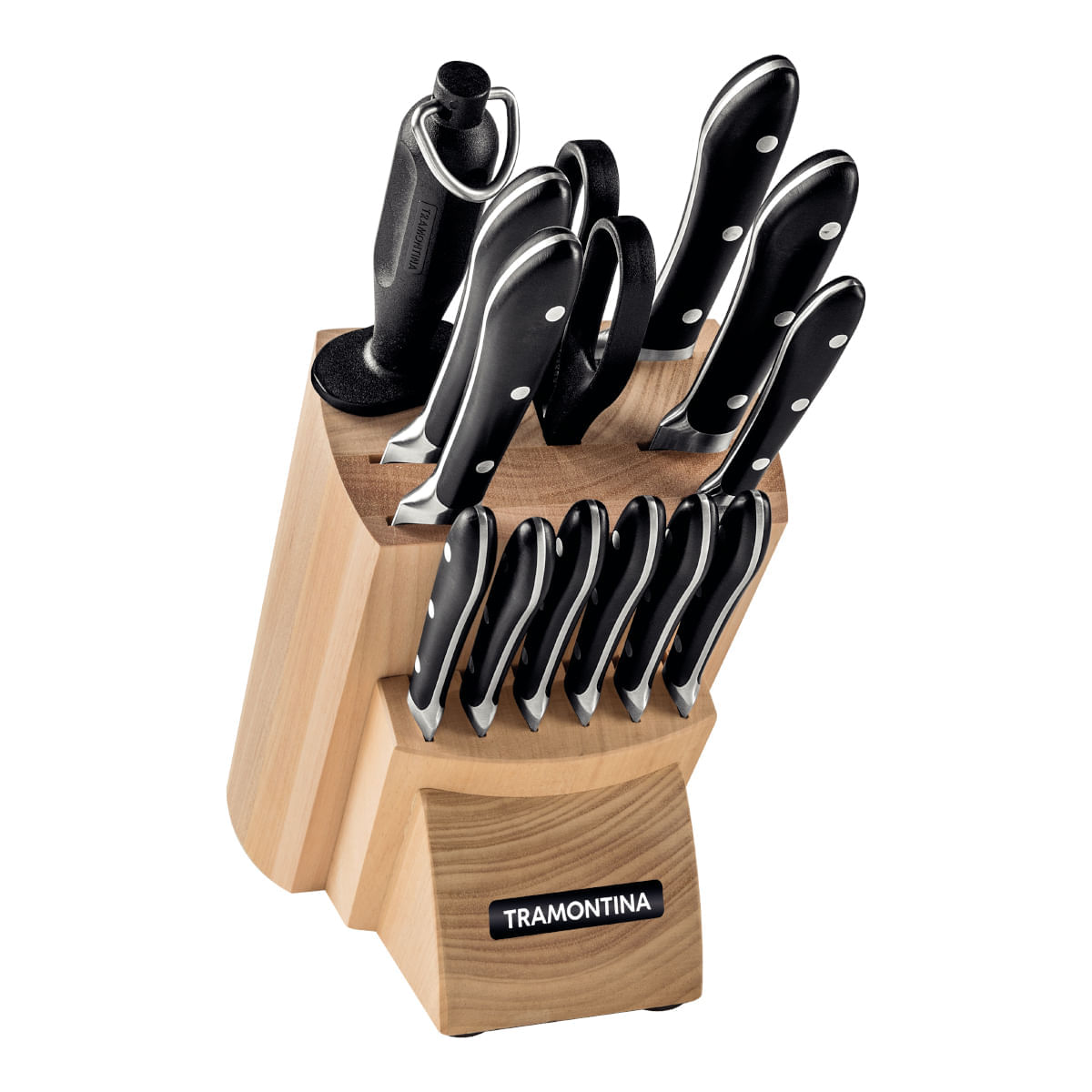 Jogo de Facas Faqueiro com Cepo em Madeira Tratada Conjunto 5 e 7 Peças Premium