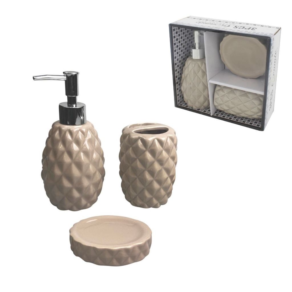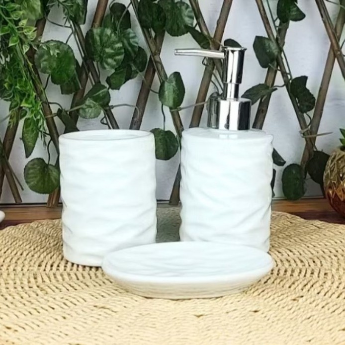 Kit Com 3 Peças Para Banheiro Em Cerâmica Dosador Porta Sabonete Líquido