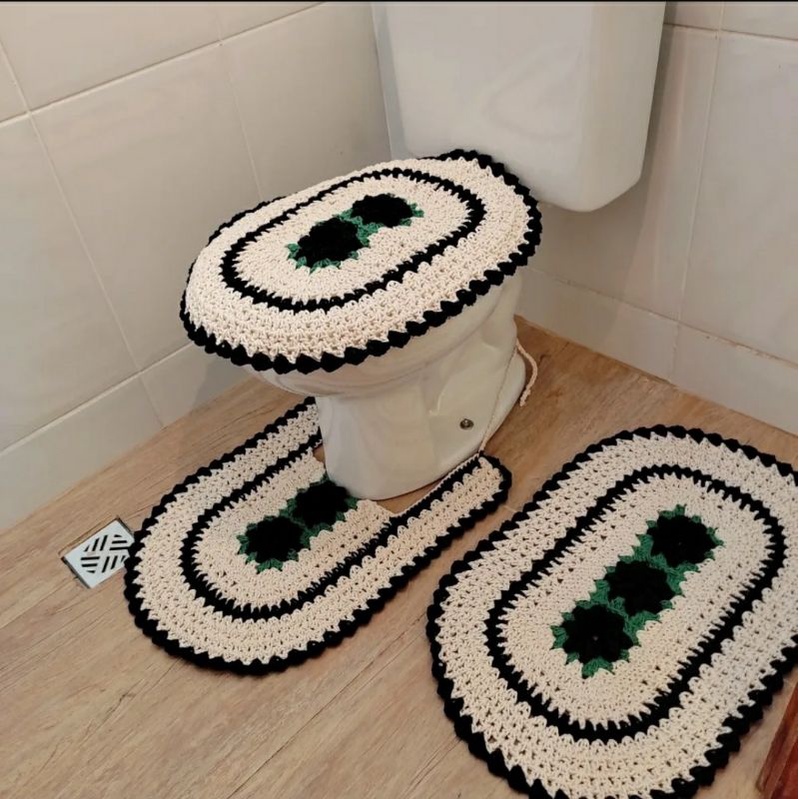 Kit Tapete Banheiro Crochê Flor Cores Variadas Jogo 3 Peças Bordado Fio Branco Decorado Neutro Colorido Artesanal