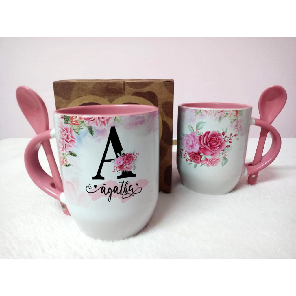 Caneca Personalizada com Colher - Rosa - Inicial do Nome - Alfabeto Floral - Presente