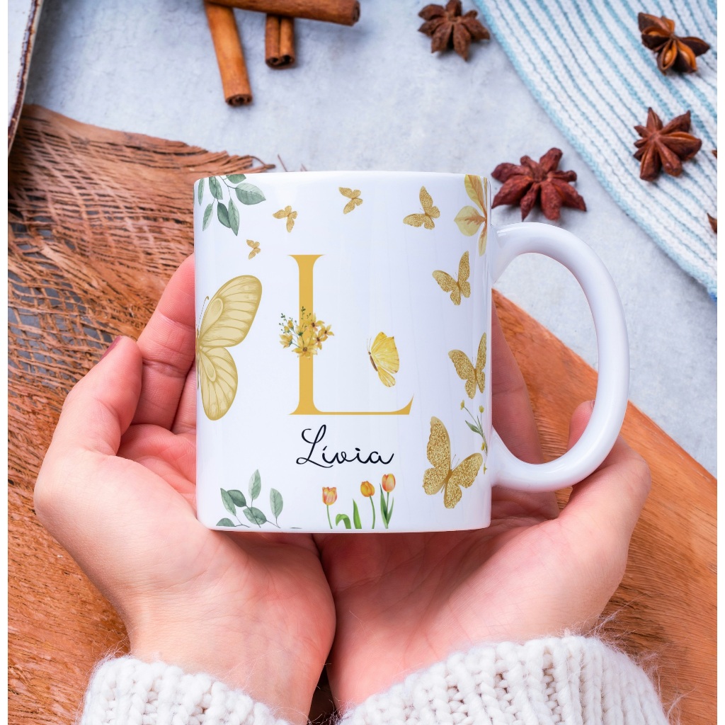 Caneca Com Inicial e Nome Borboletas Floral Porcelana Personalizada Presente Temos Todas as Letras