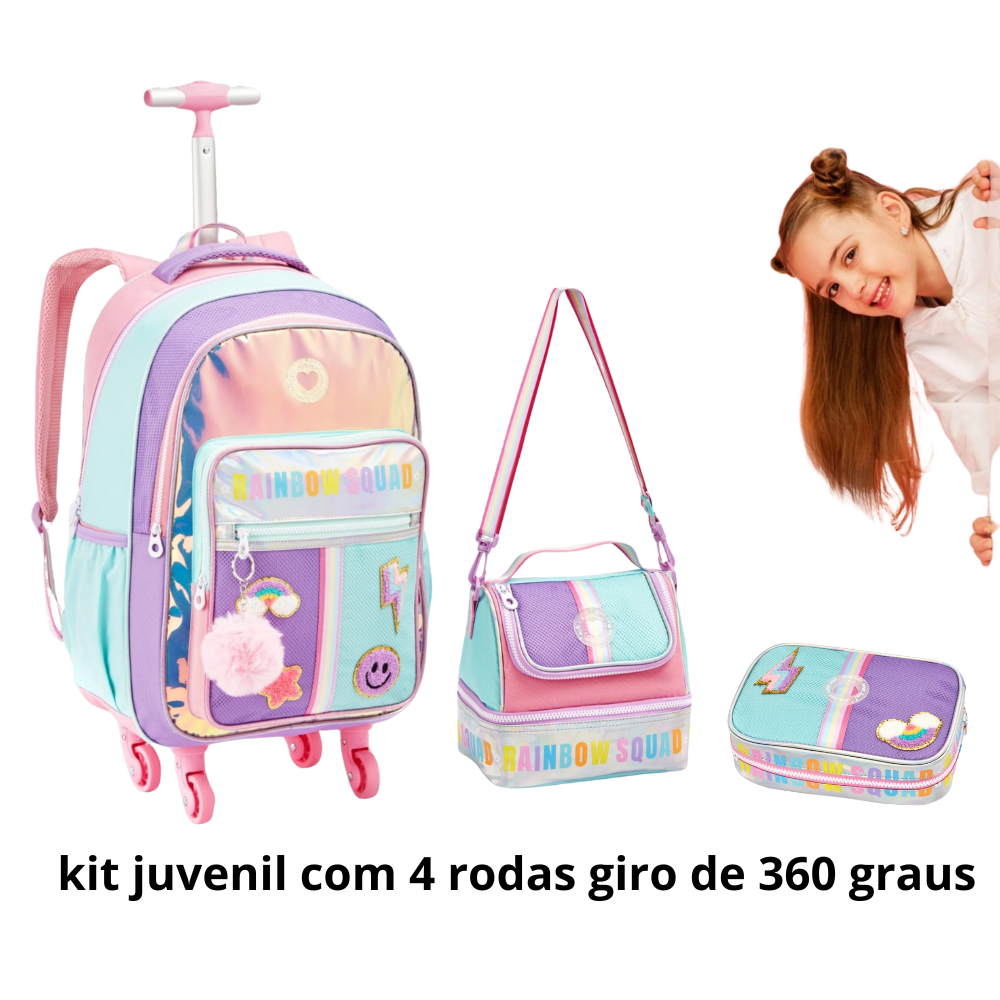 Mochila de Rodinha Menina 360 Rainbow Holográfica Com PomPom Kit Bolsa Feminina Infantil com Lancheira Térmica e Estojo