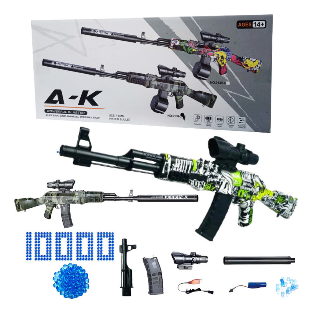 Lançador Bolinha de Gel Grande Ak47 Blaster Hidrogel Automatico+Luneta Silenciador+30Bolinhas