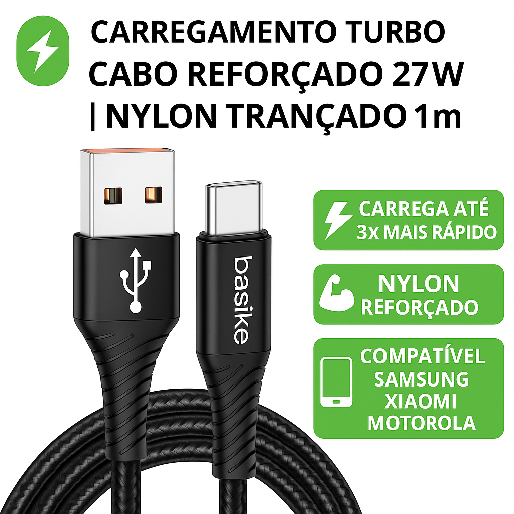 Cabo USB-C Basike 27W Nylon Reforçado 1M – Carregamento Rápido iPhone 15/16 e Android