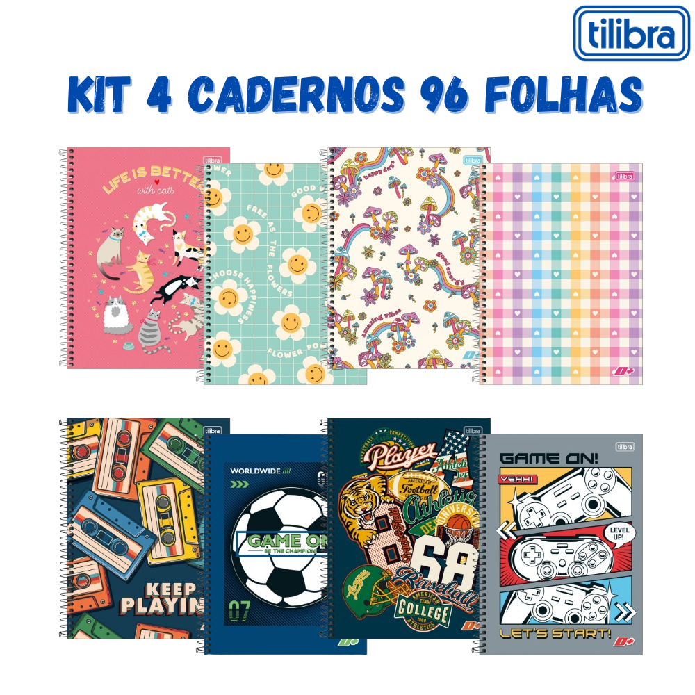 Kit 4 Cadernos 1 Matéria D+ 96 Folhas Capa Dura Masc ou Fem - TILIBRA