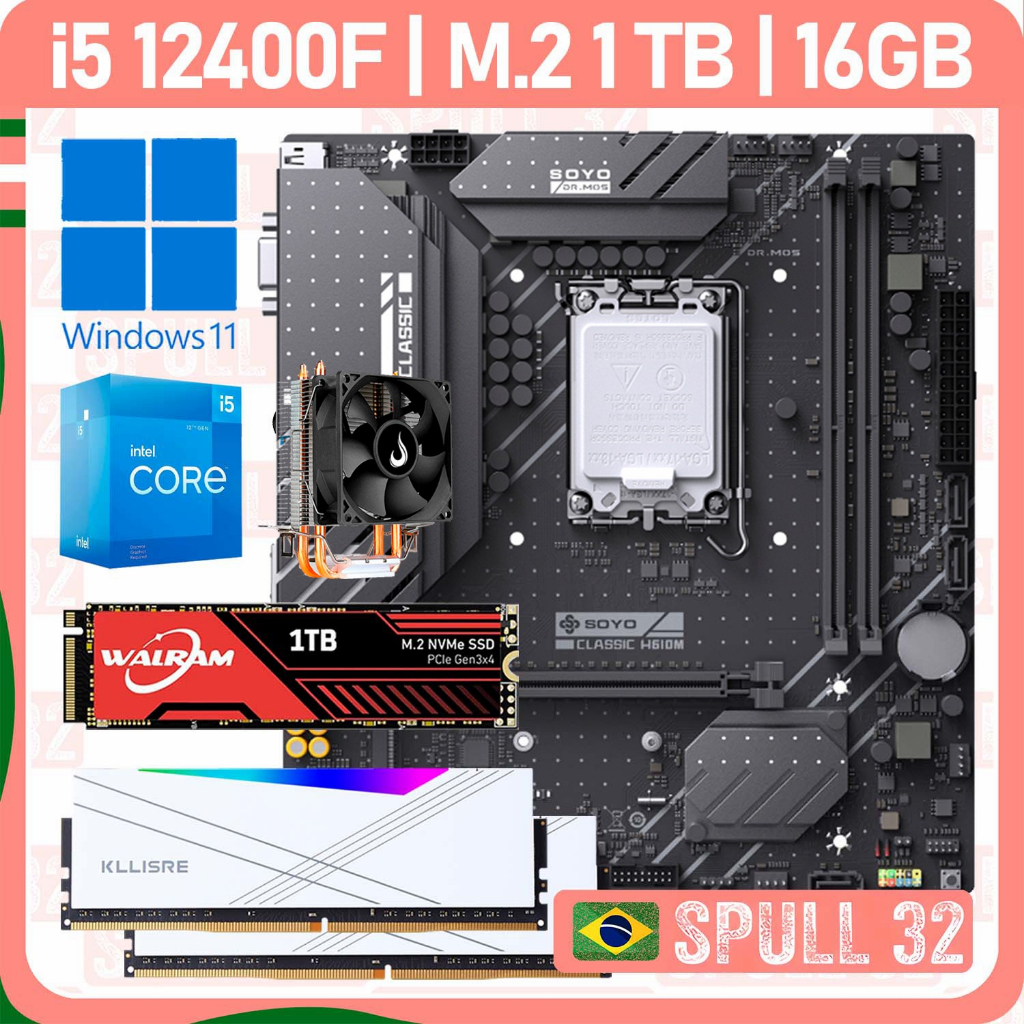 Kit Upgrade Gamer: Intel I5 12400F (12° Geração) - Memória Ram RGB 16GB DDR4 - SSD M.2 1TB - Placa-mãe SOYO H610M - Cooler Rise Mode Z2 | SPULL 32