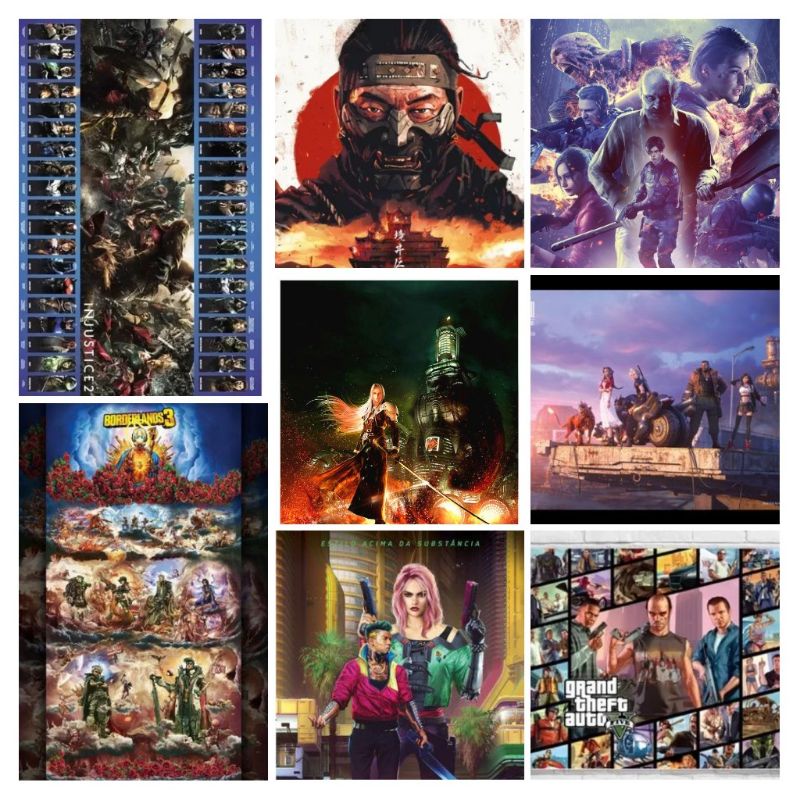 pôster resident evil, injustice 2, borderlands 3, Ghost of Tsushima, final fantasy iiv, cyberpunk 2077, gta5, GTA v, Xbox PS2 PS3 PS4 ps5 miniatura boneco anime mangá