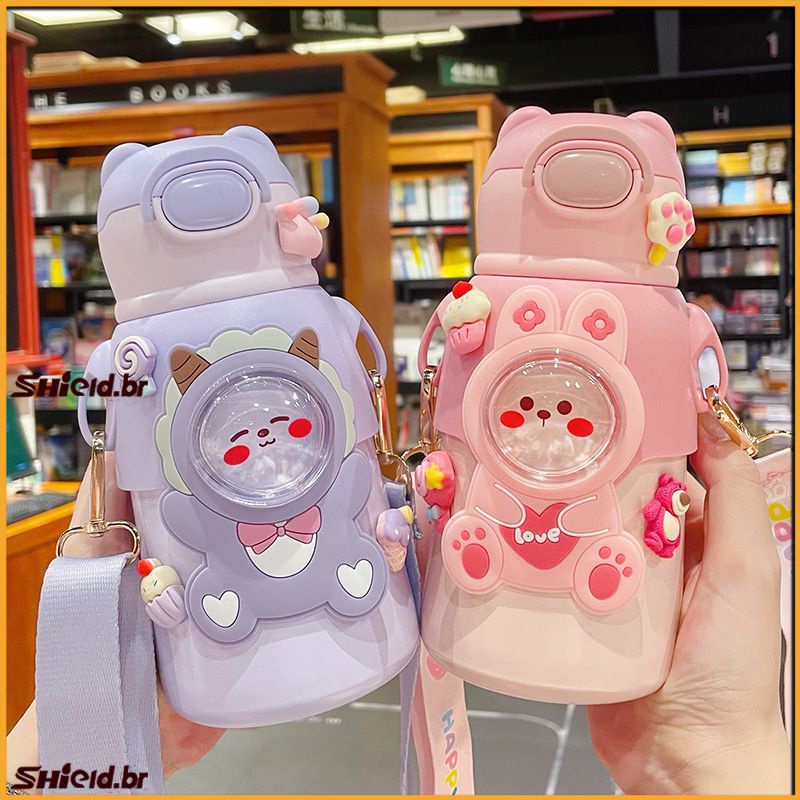 Copo de água Garrafa Térmica Infantil de 480ml Aço Inox 304 Com Alça Bolsa De Armazenamento Canudo