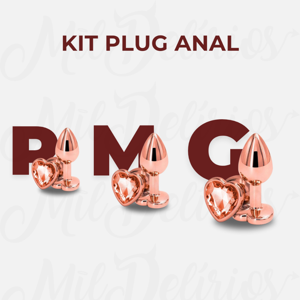 Kit Plug Anal e Vaginal Aço Inox Cor Rose Formato Coração com Joia Brilhante Tamanho P, M e G