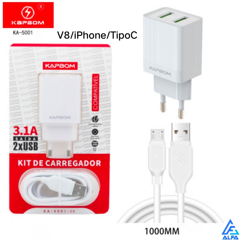 Carregador Turbo Rápido 2 USB com cabo v8/iPhone/Type-C 3.1A Alta qualidade KAPBOM Original KA-5001