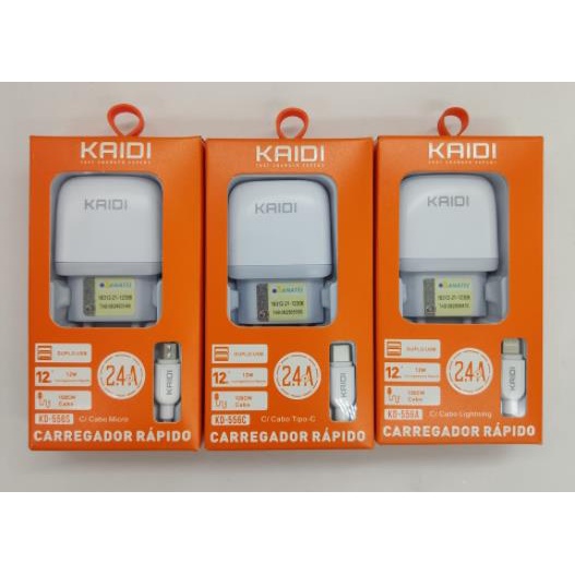 Carregador DUPLO USB 12W CARREGAMENTO RÁPIDO 2.4A Com Cabo V8 (Micro USB)/ Tipo C/ iPhone KAIDI