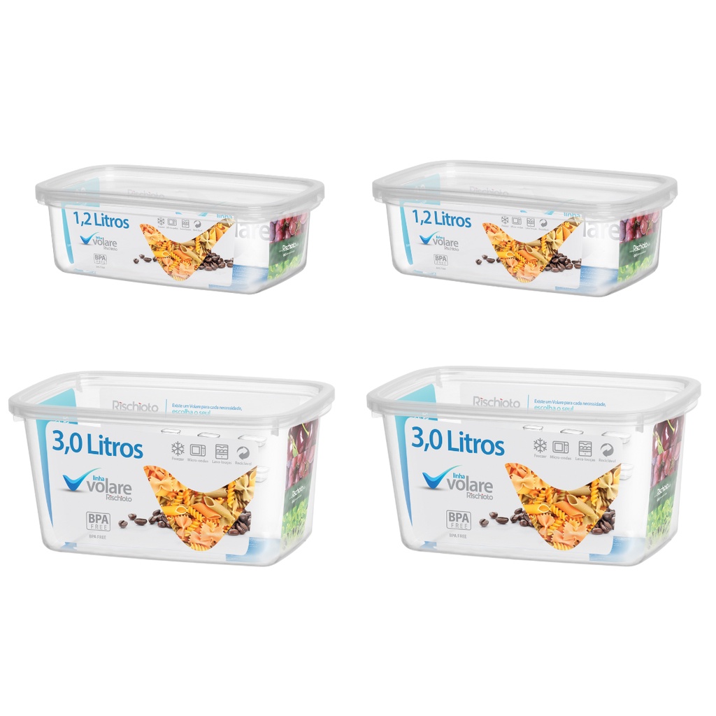 Kit 4 Unidades Potes Retangular Volare 1,2 e 3,0L Marmita Microondas Freezer Armazenar Alimentos