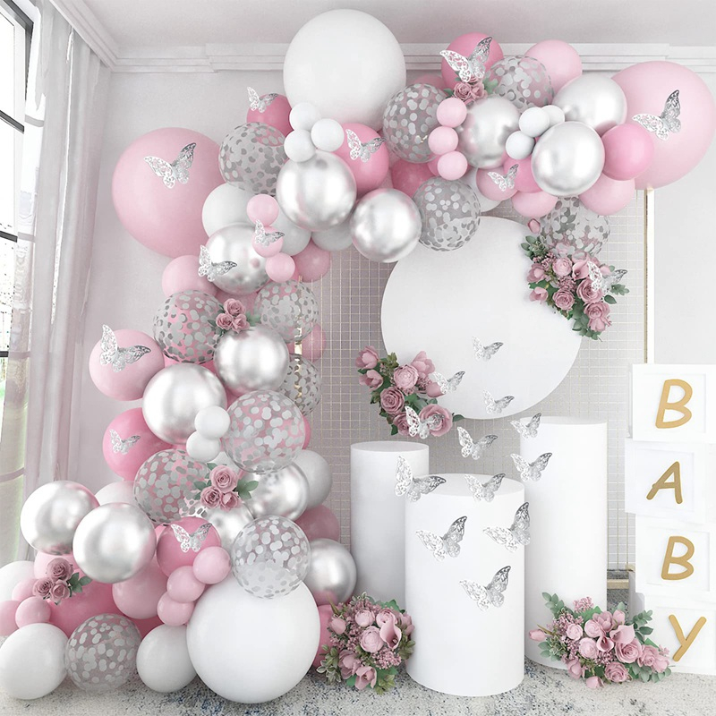 98 Pcs Butterfly Pink White Silver Confetti Balões Garland Arch Set Wings Popper Conjunto De Decoração De Aniversário Baby Shower Girls Festa Vintage Wed